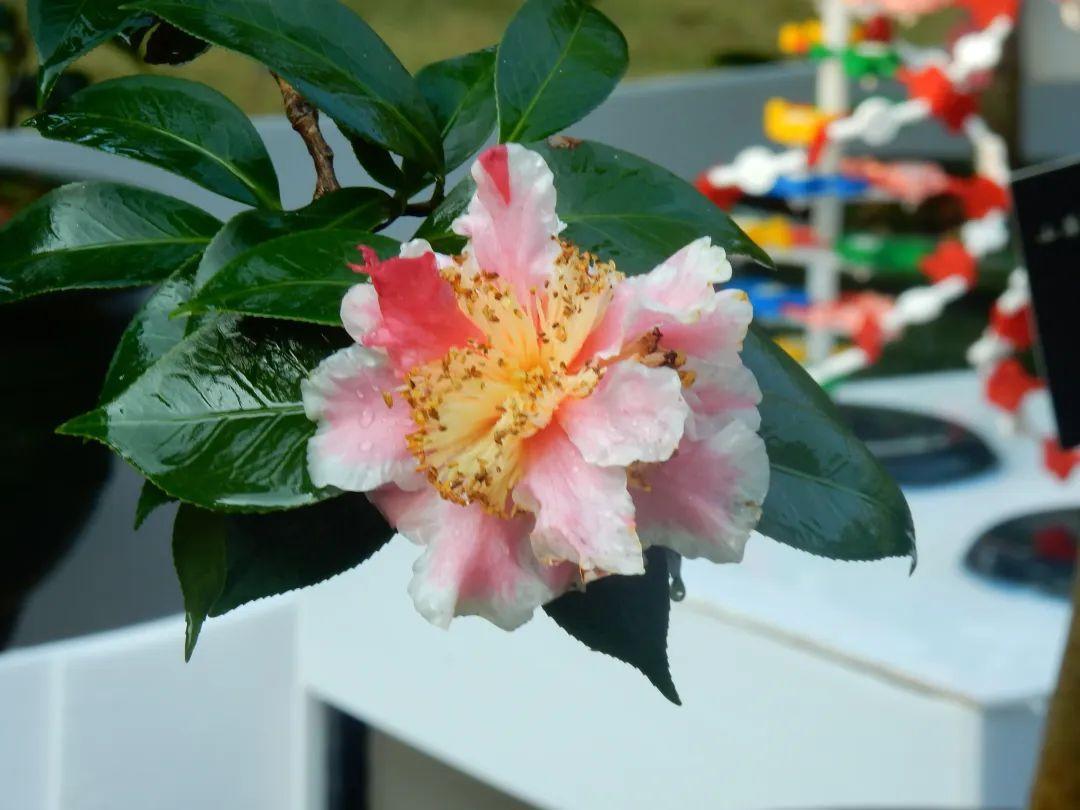 香太阳,又叫无色香茶花,也是由美国育成的一个茶花品种。花朵整体为白色,白色的花瓣上会随机出现粉色、红色或黄色的条纹和斑块,每个花朵都不太一样。香太阳属于半重瓣花型,花瓣宽圆,花朵特别硕大,花苞打开后露出里面金黄色的浓密花蕊,特别容易“招蜂引蝶”。不同于其他浓香品种略带脂粉味,香太阳的味道虽香,却属于类似苹果的水果型香气,好闻又非常清爽。