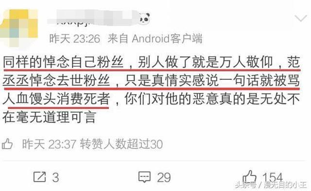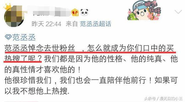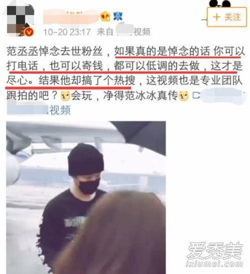 原本范丞丞是在悼念粉丝,但却被质疑买热搜炒作,消费逝者。据悉,在当天晚上,一个很厉害的大号连续发了好几条动态diss范丞丞的这种行为,这位网友先是至于范丞丞不尊重逝者,有过渡消费逝者的嫌疑,还质疑范丞丞是怎么想出来消费粉丝这一招的,最后则直言范丞丞因为姐姐的原因,这段时间的曝光度一直很低,所以才会借粉丝去世炒作自己,还说如果是真悼念的话,可以打电话,或寄钱,可以低调去做,这才是尽心,没必要搞一个热搜。