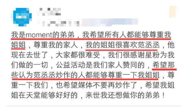 事件之后,逝者的弟弟也亲自回应称,我的姐姐很喜欢范丞丞,她现在去世了,大家都很难受,我们很感谢星粉为我们做的一切,公益活动是我们家人赞同的,希望那些认为范丞丞炒作的人都能尊重一下我姐姐,尊重一下我们,也希望媒体媒体不要再炒作。希望我姐姐能在天堂安好,来世我还想做你的弟弟。