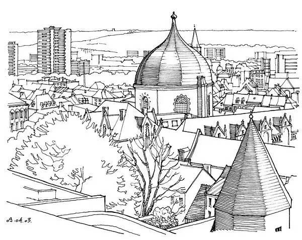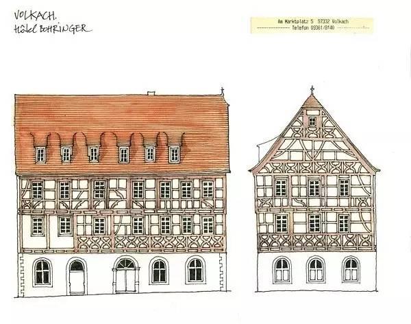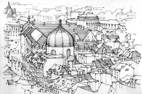 钢笔淡彩的绘画除了记录,还起着分析结构的作用。我们可以透过画面了解建筑的样式和特点。