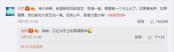 何老师也在微博中暖心回应:“啥大神啊,就是帮现场填填空,导演一喊,娜娜第一个冲上去了。如果麦有声,如果需要,我们能和大家互动一宿。在我心中,真唱才是大神”