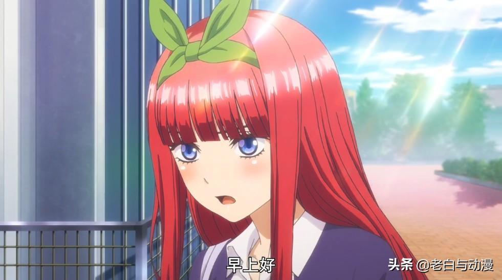 在五姐妹里面,二乃和三玖以及五月是最难区分的,尤其是发色相同之后。上面这位是混进去的二乃,看起来简直就是五月啊,在漫画里二乃和五月的发色是一样的,动画里正是怕咱们区分不出她们,因此把这三人发色都改变了,这样才能区分出来。
