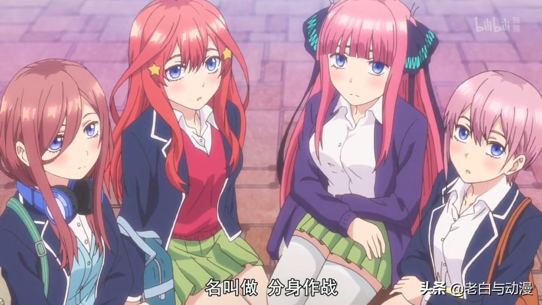以上就是当五姐妹发色相同后的样子,一花还是很好认的,毕竟头发长度不同;但是后三位二乃、三玖和五月的话,还是很难区分,毕竟她们长得一样,头发一样长。也幸好编剧把她们头发染成不同颜色,不然补番的时候都不知道哪位是二乃、三玖和五月!