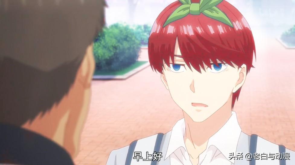 上图这位是一花,其实看起来就像剪短头发的五月,不过因为头发剪短了,因此比较好认。上图是分身大作战里一花欺骗老师混进学校,而且还成功了。其实真实的一花应该是这样的,和大家发色一样,这样的话老师是认不出来的。