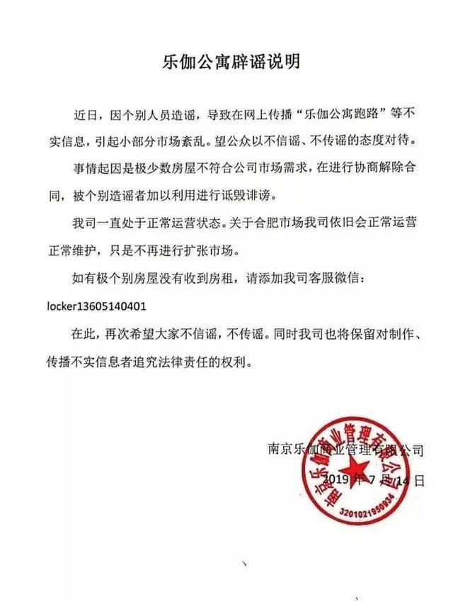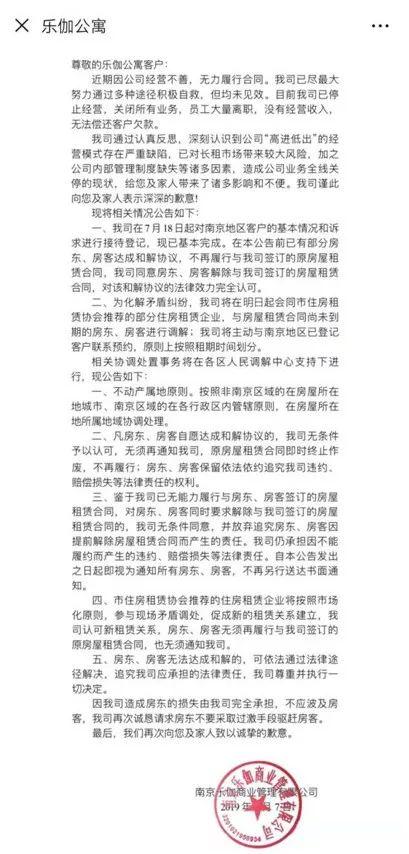 乐伽公寓租户维权事件后续来了:没钱!停止经营,关闭所有业务