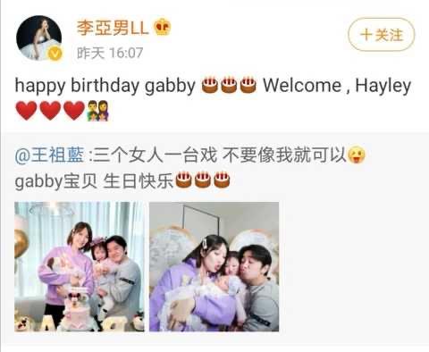 而在去年的12月17日,王祖蓝在自己的社交媒体平台上晒出一张全家福为大女儿庆生,同时官宣与李亚男二胎得女的喜讯,并表示“三个女人一台戏,不要像我就可以了”,但从如今王祖蓝晒出的全家福来看,2岁的gabby和Hayley的长相都是比较随爸爸的,也是基因极其强大了啊!