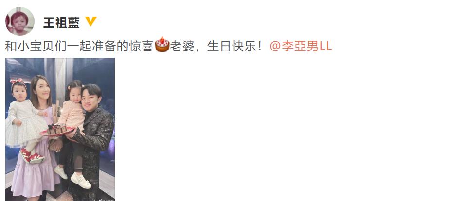 11月26日,王祖蓝自己的社交媒体平台上晒出了一张一家四口的全家福为妻子李亚男庆生,并配文表示“和小宝贝们一起准备的惊喜”,喊话李亚男“老婆,生日快乐!”十分甜蜜。