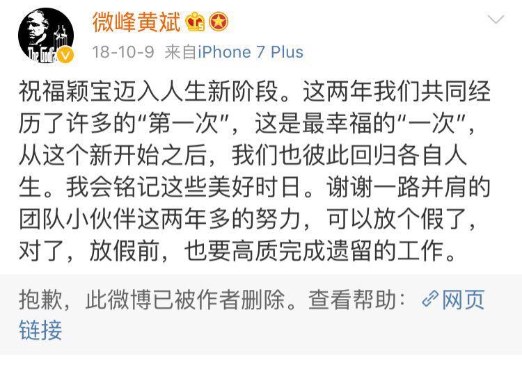 2018年10月9日,赵丽颖发文,宣布结束与经纪人黄斌的合作,还表达了对黄斌的感谢之意。随后,黄斌转发,并祝福赵丽颖迈入人生新阶段。