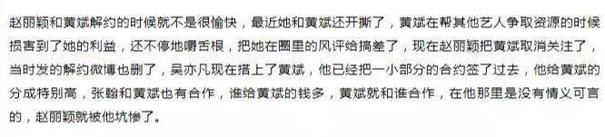 4月29日,有网友发现赵丽颖取关了前经纪人黄斌,而且还将去年解约时感谢黄斌的微博删除,并爆出赵丽颖在解约时就已经和黄斌闹得不愉快了,而最近黄斌在帮其他艺人争取资源的时候,损害了赵丽颖的利益。