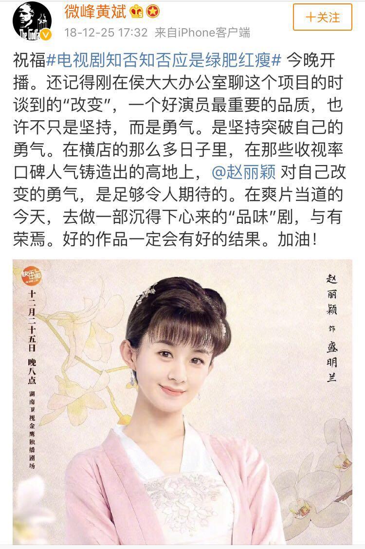 赵丽颖近几年人气飙升,陆续出演了《陆贞传奇》、《杉杉来了》、《花千骨》等影视剧,肯定离不开经纪人这个幕后推手。在赵丽颖出演的《知否》播出时,黄斌还发博为其宣传。
