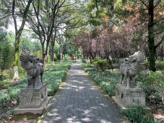 龙池之左,为支硎山,山上多巨石,形大而平,如硎石。龙池之右,为花山一部,亦多石,小而形异,如滚石。山中多绿色,高低混杂,有竹,槐,栎,香樟尔,杂而共居,和谐共生。