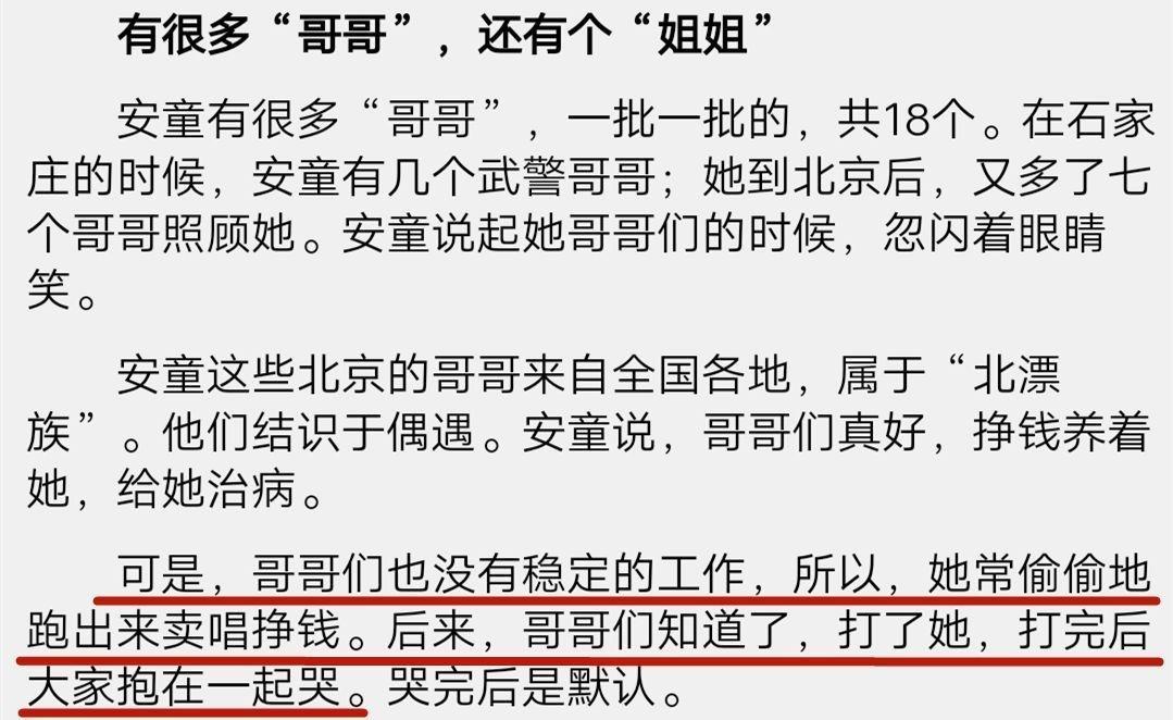 这些哥哥姐姐对待刘安童是有求必应,照顾得无微不至,挣钱给她看病。据刘安童讲:因为她的哥哥姐姐经济条件也都不富裕,所以她特别想也能出一份力。于是她有一次就偷偷溜出去卖唱,后来被大家找到而且还骂了她,就这样这群年轻人抱头痛哭。看来他们的感情是比亲人还要亲。直到2007年一纸诉状掀开了刘安童的真正面目。