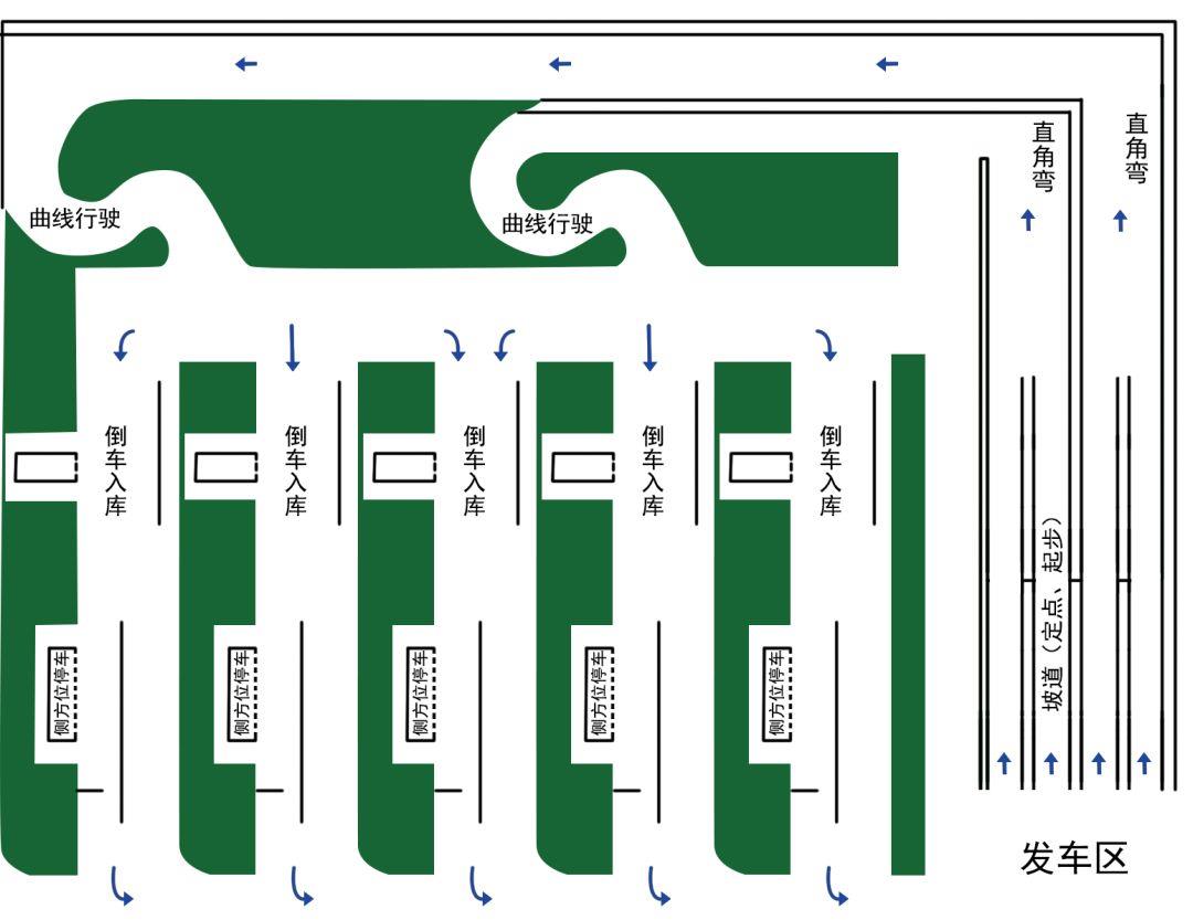 坡道定点与起步→直角转弯→S弯→倒车入库→侧方位停车