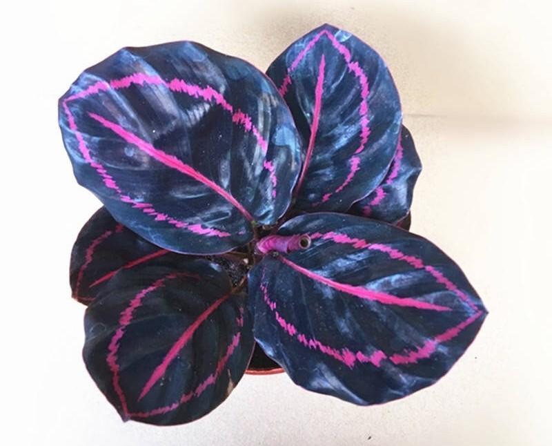 红美丽竹芋的叶子颜色是墨绿色的,中间有玫红色的叶脉。