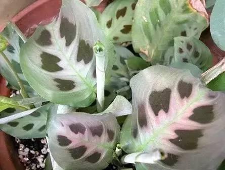 红玫瑰竹芋它的叶子同样也很圆,但是没有青苹果竹芋那么大,它的叶子上面有粉红的颜色,像红玫瑰一样,特别是新长出来的叶子。