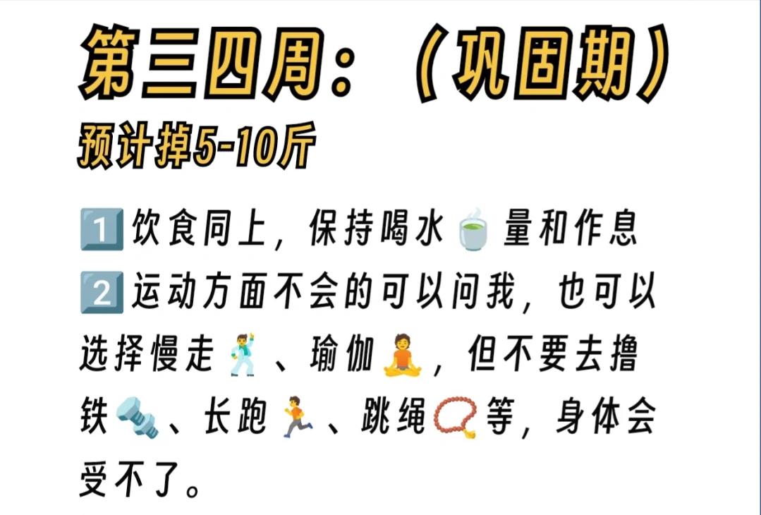 第三和第四周是巩固期,你可以预计减重5-10斤。饮食方面与前两周相同,保持充足的水摄入量和规律的作息时间。