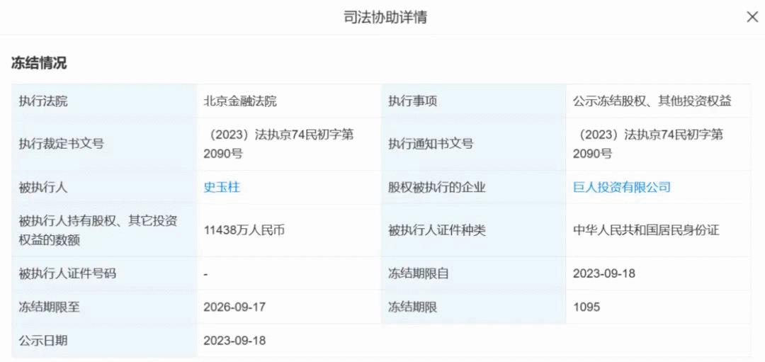 史玉柱这次被推上风口浪尖,是因为他股权被冻结1.4个亿,成了被执行人,这一冻结就是三年。