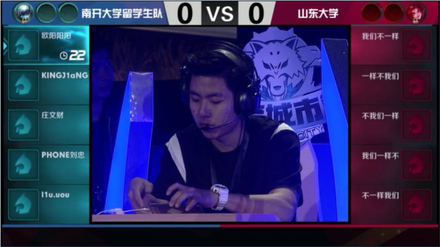 最后一个。这是两所大学之间的友谊战,南开大学留学生对阵山东大学,两所大学都是985高校。亮点在于山东大学的队员昵称,选手“我们不一样”应该是队长了,占据着核心位置,手下四个小弟都在模仿大哥。这组战队昵称,估计能气死对面,比赛是否能赢无所谓,毕竟从气势上来说他们已经赢了。