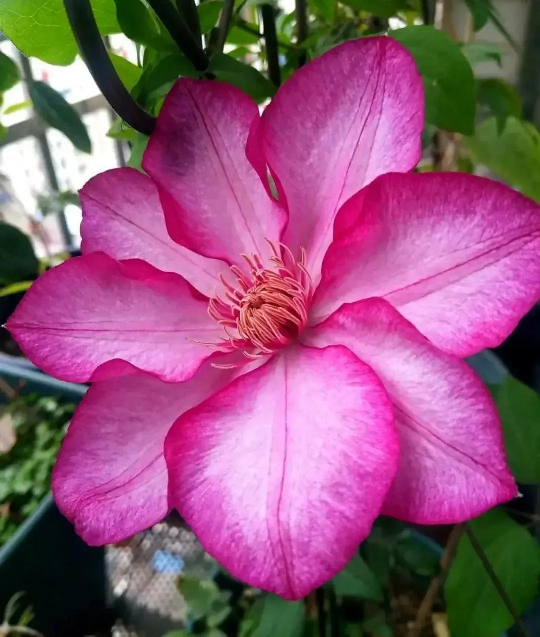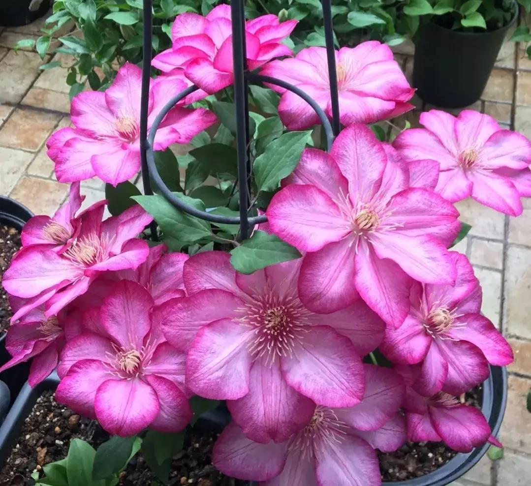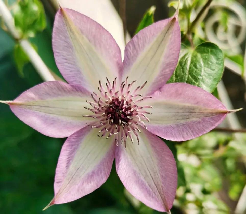 乌托邦,花友最喜爱的铁线莲品种之一,花心浅粉色花瓣边缘紫色晕染,光照不足时花色会偏白一些,单瓣大花直径可达15公分,花期主要集中在5-6月和9-11月,耐荫耐晒勤花群开时特别的壮观,新手最值得入手的品种。