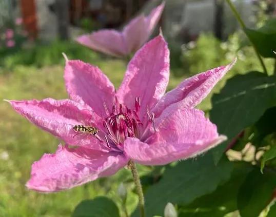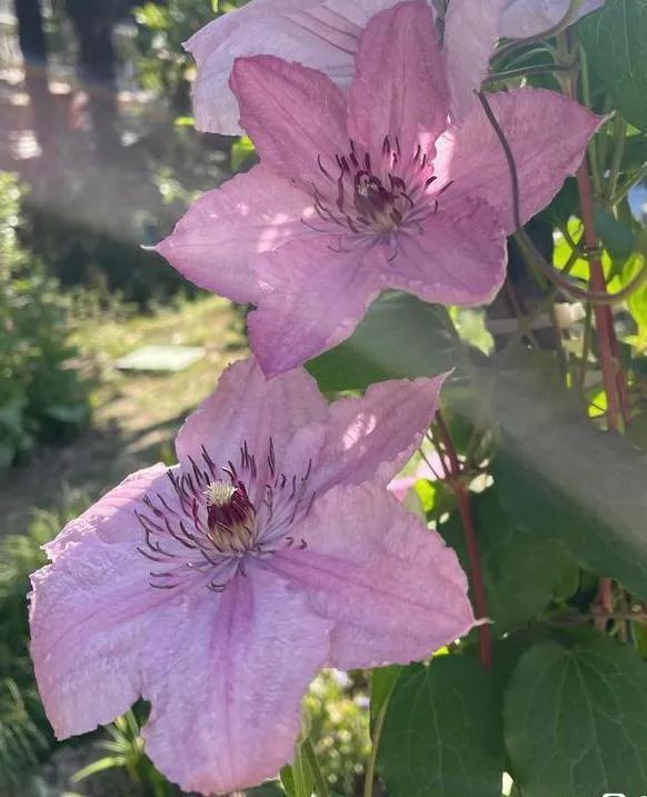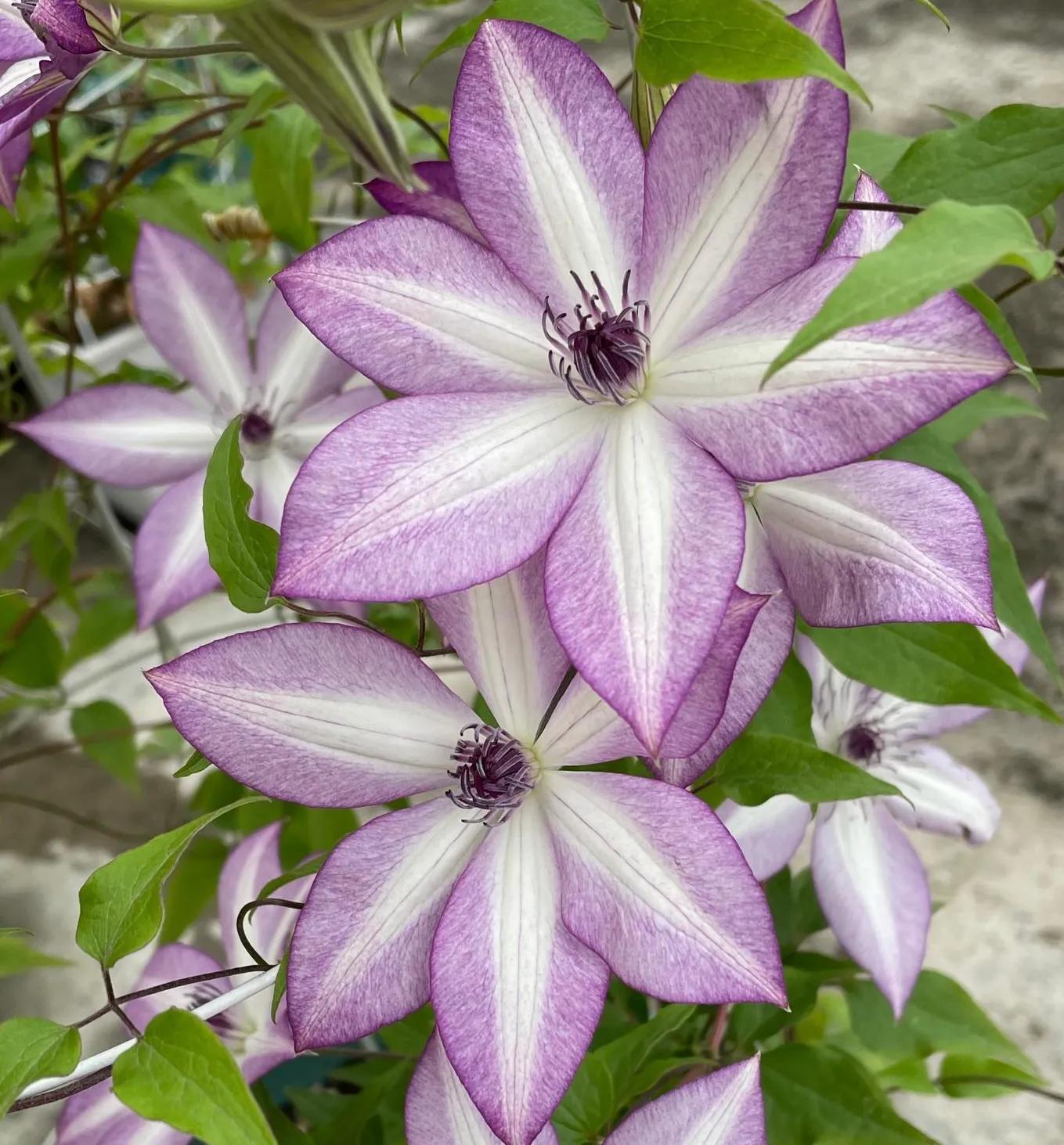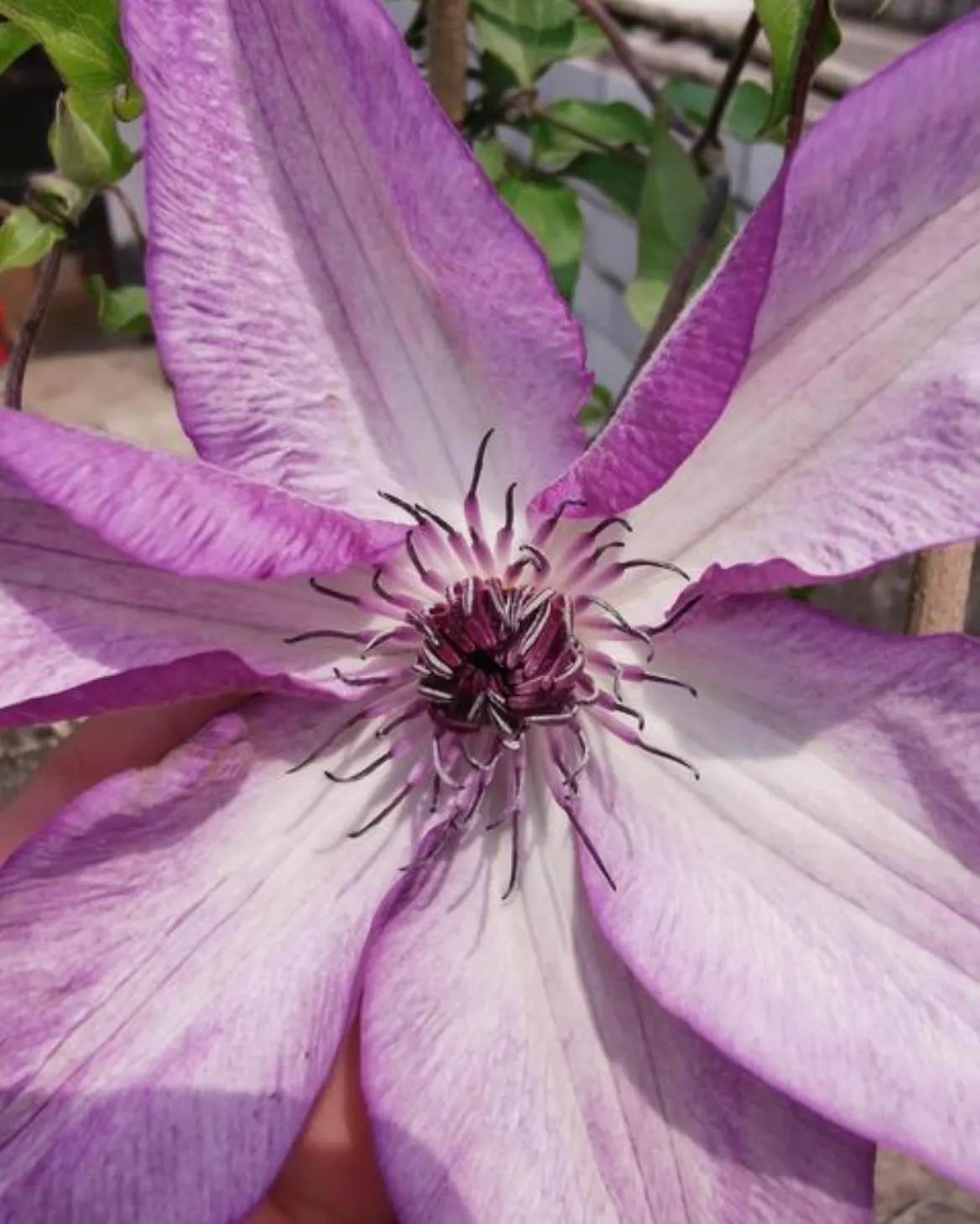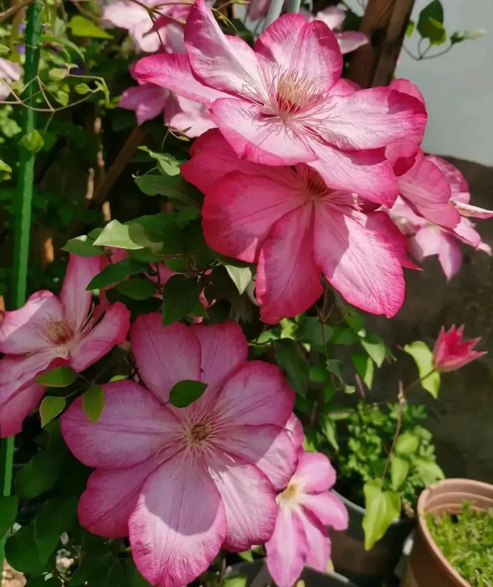 乌托邦,花友最喜爱的铁线莲品种之一,花心浅粉色花瓣边缘紫色晕染,光照不足时花色会偏白一些,单瓣大花直径可达15公分,花期主要集中在5-6月和9-11月,耐荫耐晒勤花群开时特别的壮观,新手最值得入手的品种。