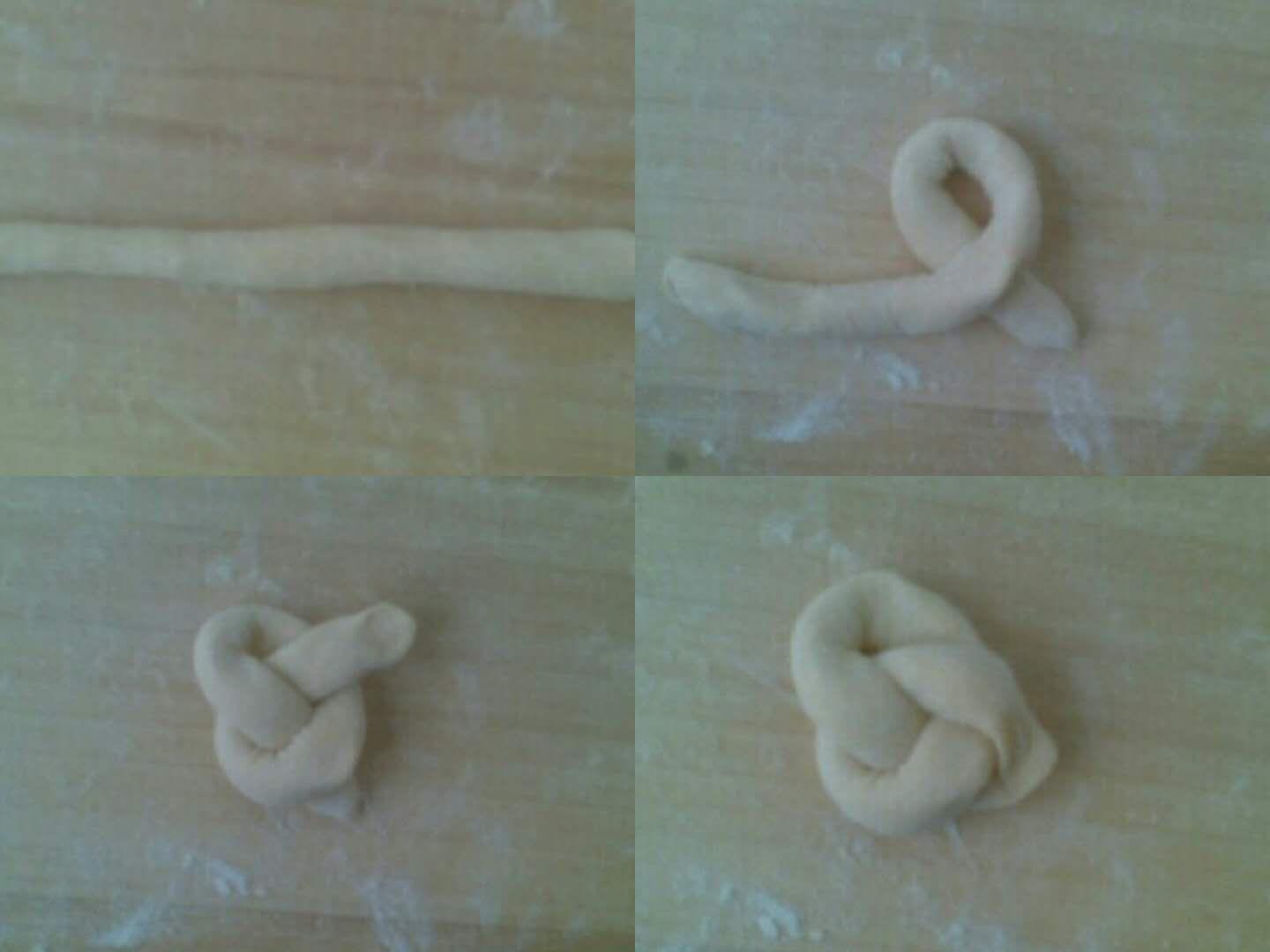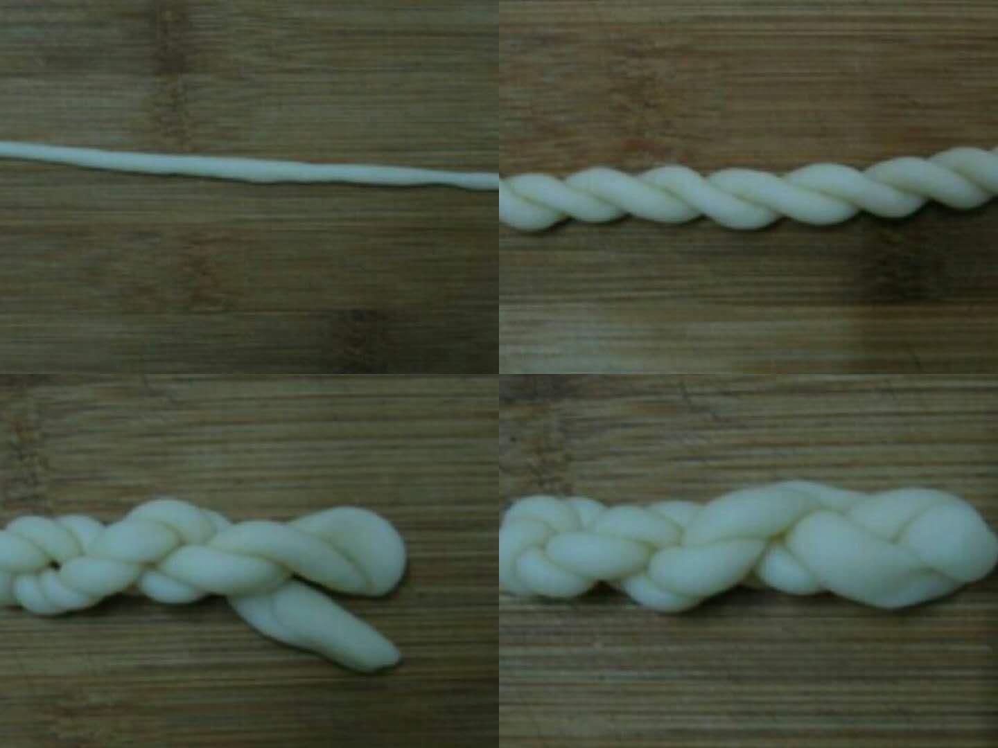 7、面团搓成细条,一头搭过来,长的一端从中间穿过,把两段捏好即成。锅中油烧至七八成热时,放入结果,小中火炸至表面金黄即可出锅。