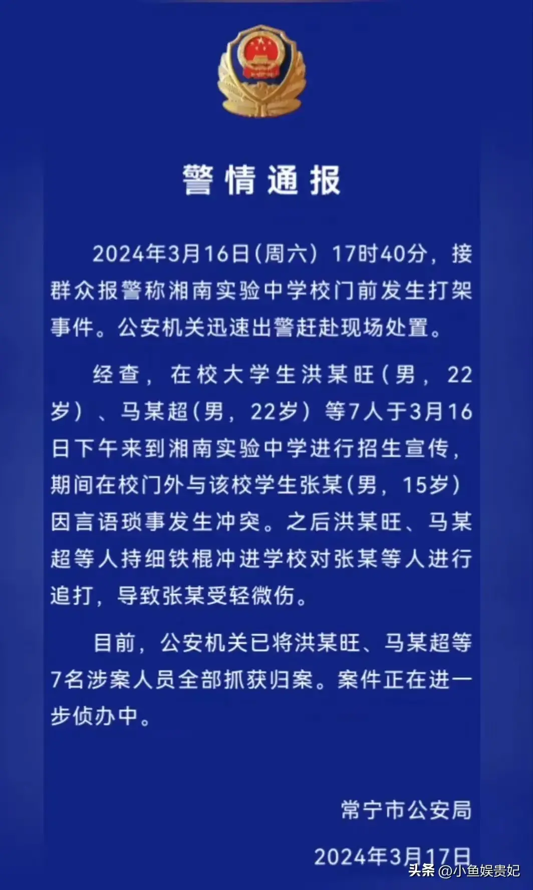 事件发生后,当地警方接到群众报警,公安机关迅速出警并将7名涉案人员抓获,据调查,7名打人青年都是在校大学生(年龄都是22多),3月16日下午,7人来湘南室验中学进行招生宣传,在校门外与该校子生张某(男,15多)发生冲突,于是手提棍棒追进校园追打,导致张某受轻微伤。