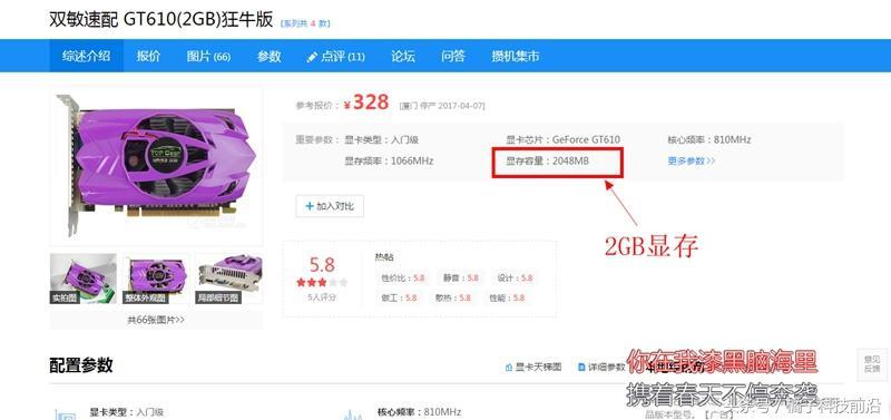 那么为何这样一款显卡还会被拿出来调侃呢?槽点就在它的显存上,标准显存为1GB,而非公版上甚至出现过2GB显存的GT610,比如双敏速配 GT610(2GB)狂牛版(已关门)。