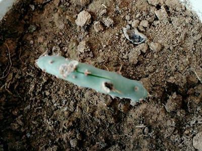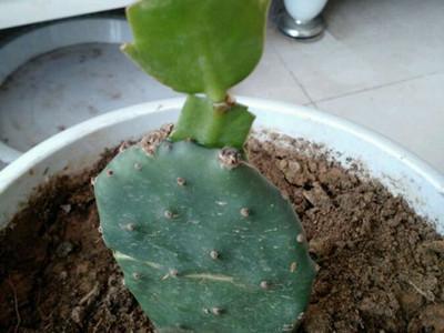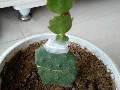 步骤三:把处理好的蟹爪兰叶片插进开好口的仙人掌上,用刀子拨一下开口,把蟹爪兰塞进去,一定要塞紧哦,塞进去后会有一些粘液溢出,就刚刚好。