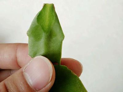 步骤二:把要嫁接的蟹爪兰叶片去皮,削去底部一厘米左右即可,一定要用锋利的刀子,削成契字形,一步成型。特别注意:叶片上边削去的部分要薄一些,底部削去的部分适当的多一些,如果叶片底部太厚就不容易插进去。