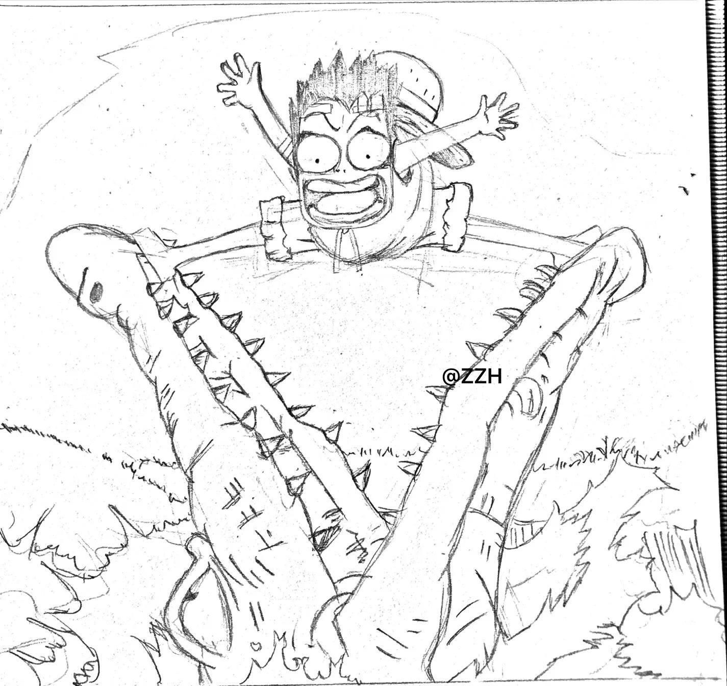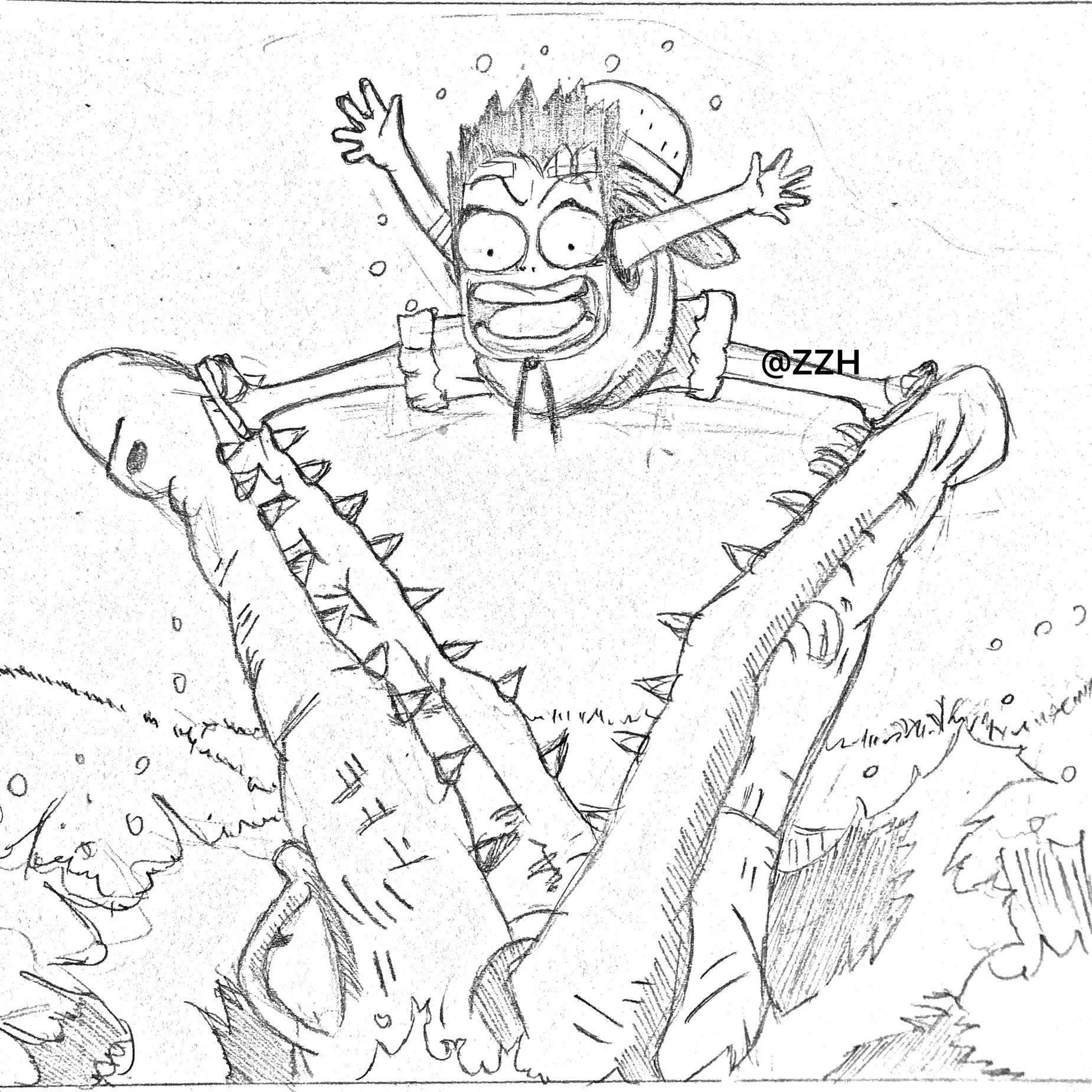 第六步:在路飞脚的下方,画出鳄鱼的嘴巴和头部轮廓(注意:鳄鱼的牙齿是月牙弯的形状每颗牙齿的距离)鳄鱼的眼珠是月牙弯的形状。