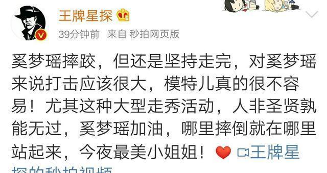 要知道,她这一摔,可是维密史上的第一摔。没人愿意把这样的“光荣”留在自己身上。虽然,模特走秀,摔倒司空见惯,但是像奚梦瑶这样的超模,特别是作为维密天使,戴着大翅膀的超模,在走秀过程中跌倒,是少之又少的。