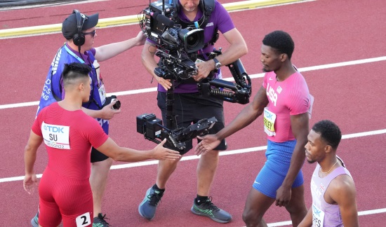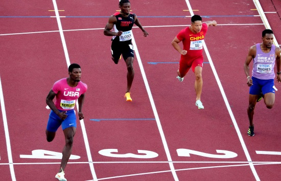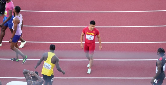 7月15日,中国选手苏炳添(左下)在男子100米预赛后与美国选手克里(右二)互相致意。最终,苏炳添晋级半决赛。 新华社记者 吴晓凌 摄