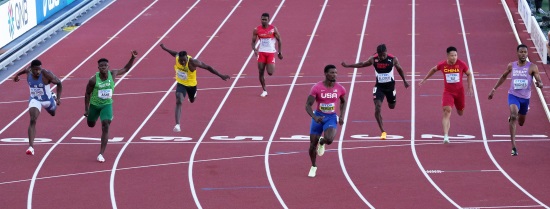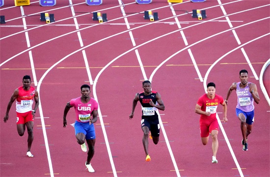 7月15日,中国选手苏炳添(右二)在男子100米预赛中冲过终点。最终,苏炳添晋级半决赛。 新华社记者 王迎 摄
