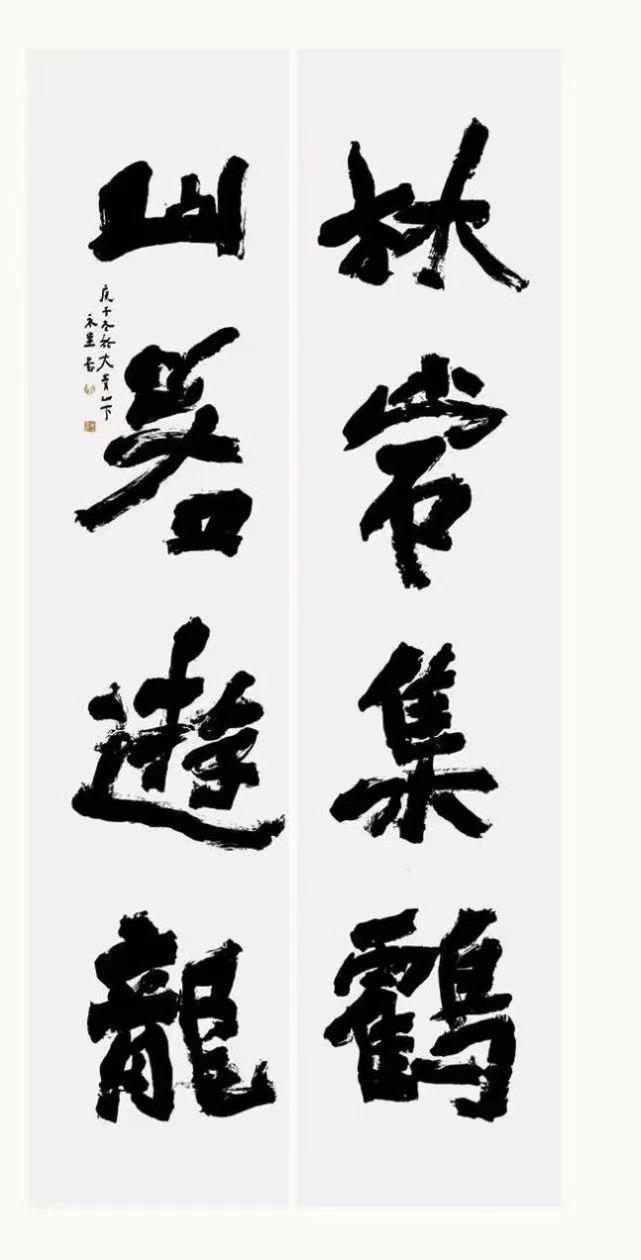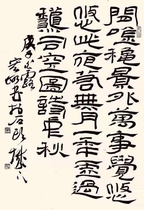 他的行书,从二王入手,继而学习王铎、何绍基,劲力洒脱,欹斜与端正相互错落,形成较强的视觉张力。同时,又兼有从容委婉、苍郁雄畅的书风。