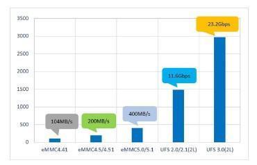那么闪存呢?它其实和电脑的硬盘一样,预先装着所有程序的文件,当需要使用的时候读取出来使用。那么它的读写速度就直接导致了应用的运行速度,不是么?你处理器再快,内存再大,但是闪存的读取速度不行,另外两个还不是只能眼巴巴地干等着。随着我们现在使用的APP越来越大,尤其是现在的手机游戏动不动好几个G的大小。读取速度就变得越来越重要。而UFS 3.0标准的读取速度,接近于UFS 2.1读取速度的两倍。
